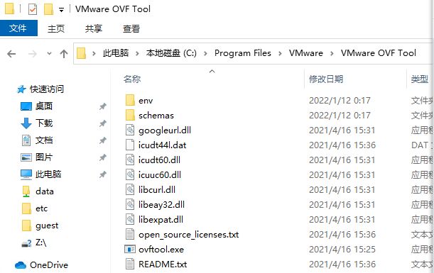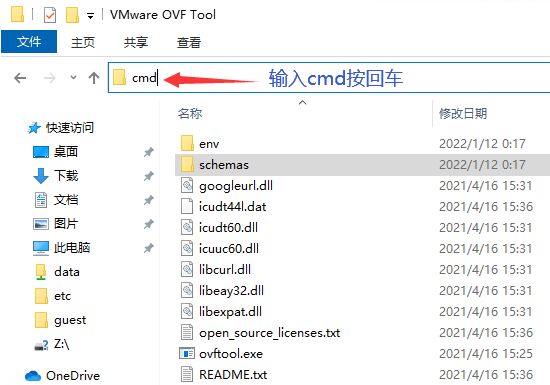 虚拟主机先关机 进入VMware OVF Tool的安装目录,在地址栏中运行cmd