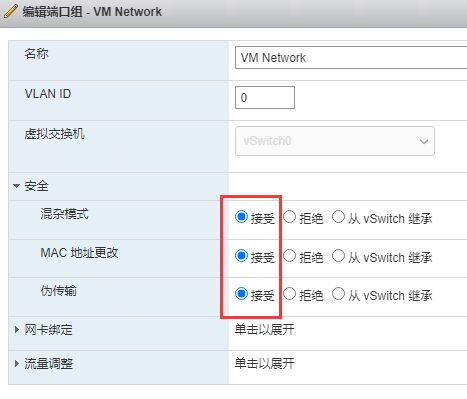 另外在虚拟交换机的端口组需要开启混杂功能,要不通信有问题,开启混杂的原因:VMware 虚拟交换机上只能感知到其上的虚拟机,但无法感知到嵌套后其上虚拟机的子虚拟机的 MAC地址,所以通信时候,用子虚拟机通信到VMware 最底层虚拟交换机就会丢包。
