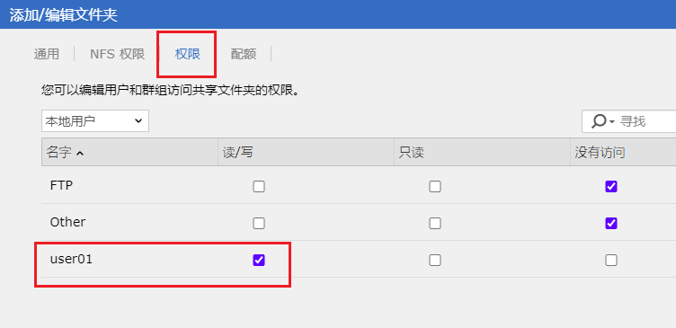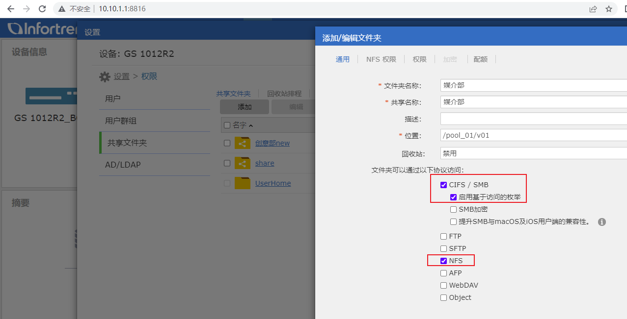 1、登录管理页面首页,“设置”—“权限”—“共享文件夹”—“添加”,新建一个共享文件夹,按下图勾选协议。
